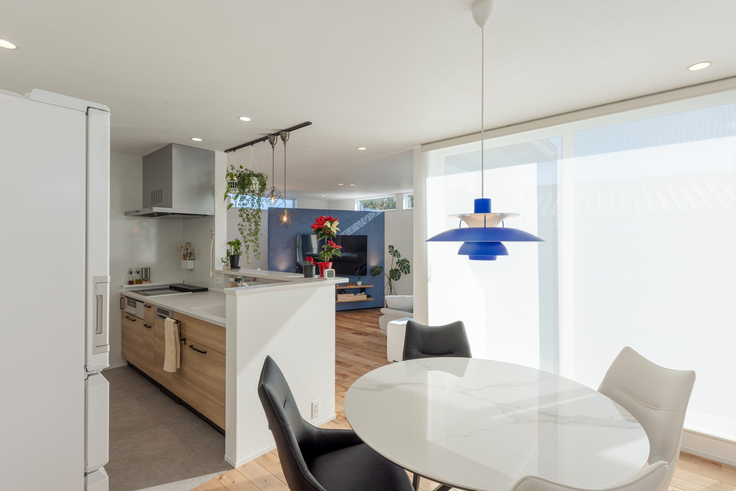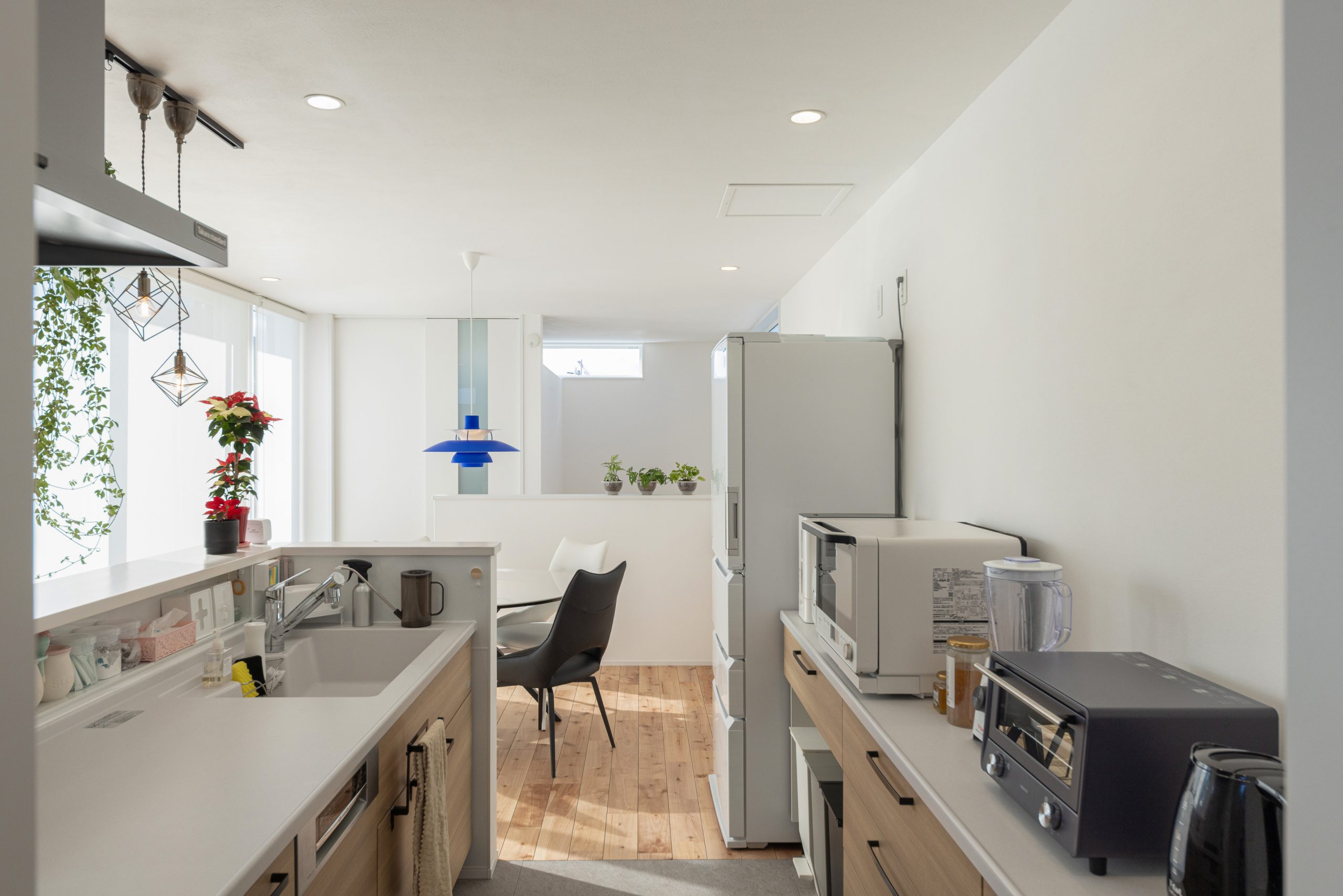 ダイニングやテラスへ視線が抜ける開放感も心地よく、自然光とグリーンに包まれる、使い勝手と美しさを両立したキッチンです。
