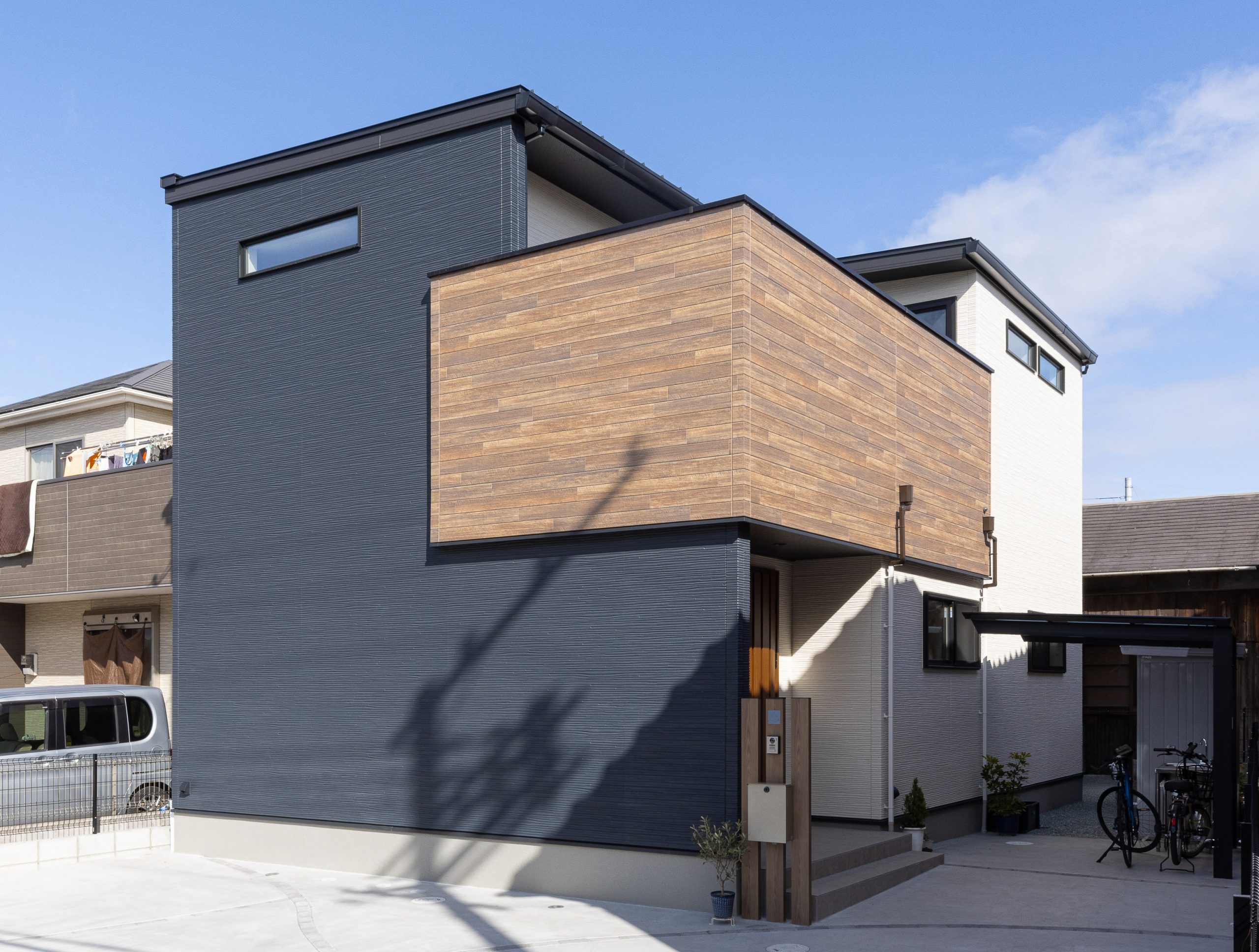 すっきりとした直線的なフォルムに、木目調の壁面がやわらかなアクセントを添え、スタイリッシュでありながら温かみも感じられる佇まいに仕上がっています。