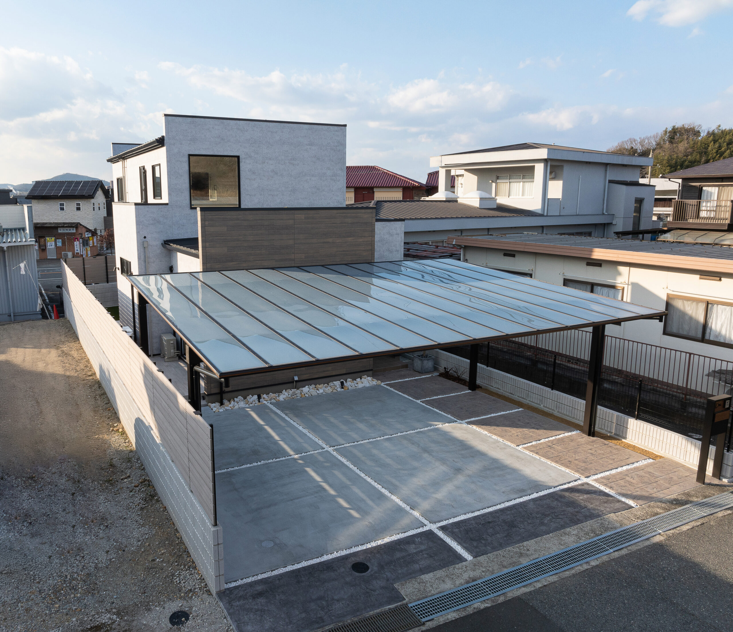 コンクリートとタイルを組み合わせた広々とした駐車場は、車の出し入れがしやすく実用性も抜群。全体を覆う大きなカーポートは迫力があり、雨の日も安心して乗り降りできます。外壁には木目調を取り入れ、シンプルながら温かみを感じる外観に仕上げました。夜にはライトアップが施され、昼間とはまったく異なる幻想的な雰囲気に。庭まわりには芝生とフェンスを設けてプライベートを守り、家族が安心して過ごせる空間を実現しました。