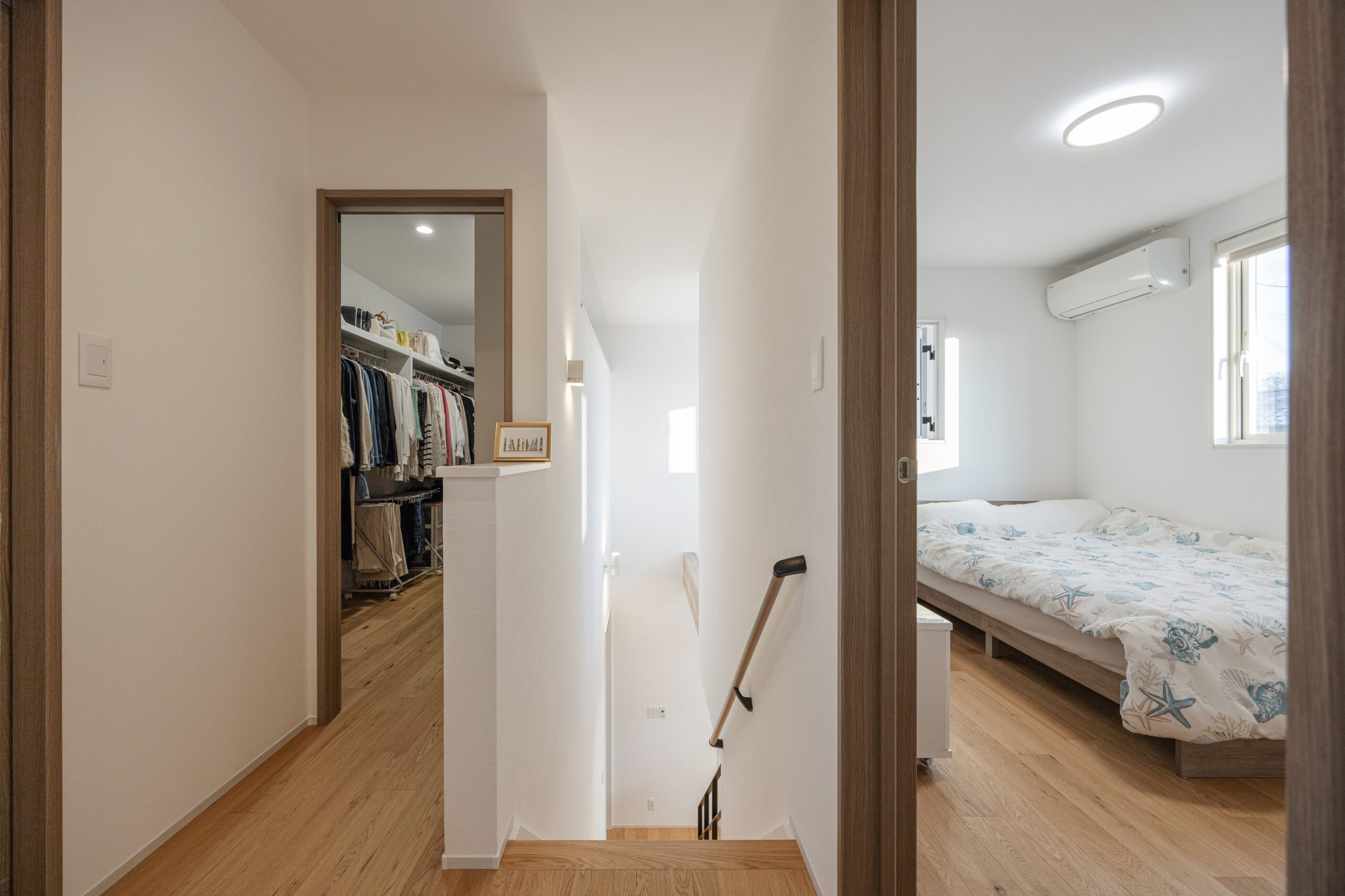 寝室は窓の配置やサイズにこだわり、小窓から外の景色が抜けることで広がりと奥行きを感じられる設計に。リビングから見える窓もデザインポイントのひとつとなっています。壁の一部にはデザインクロスを採用し、落ち着きの中にアクセントを加えました。隣接するファミリークローゼットは棚とパイプを活用し、服やバッグを効率よく収納。上部から光を取り入れることで、明るく快適に使える空間になっています。