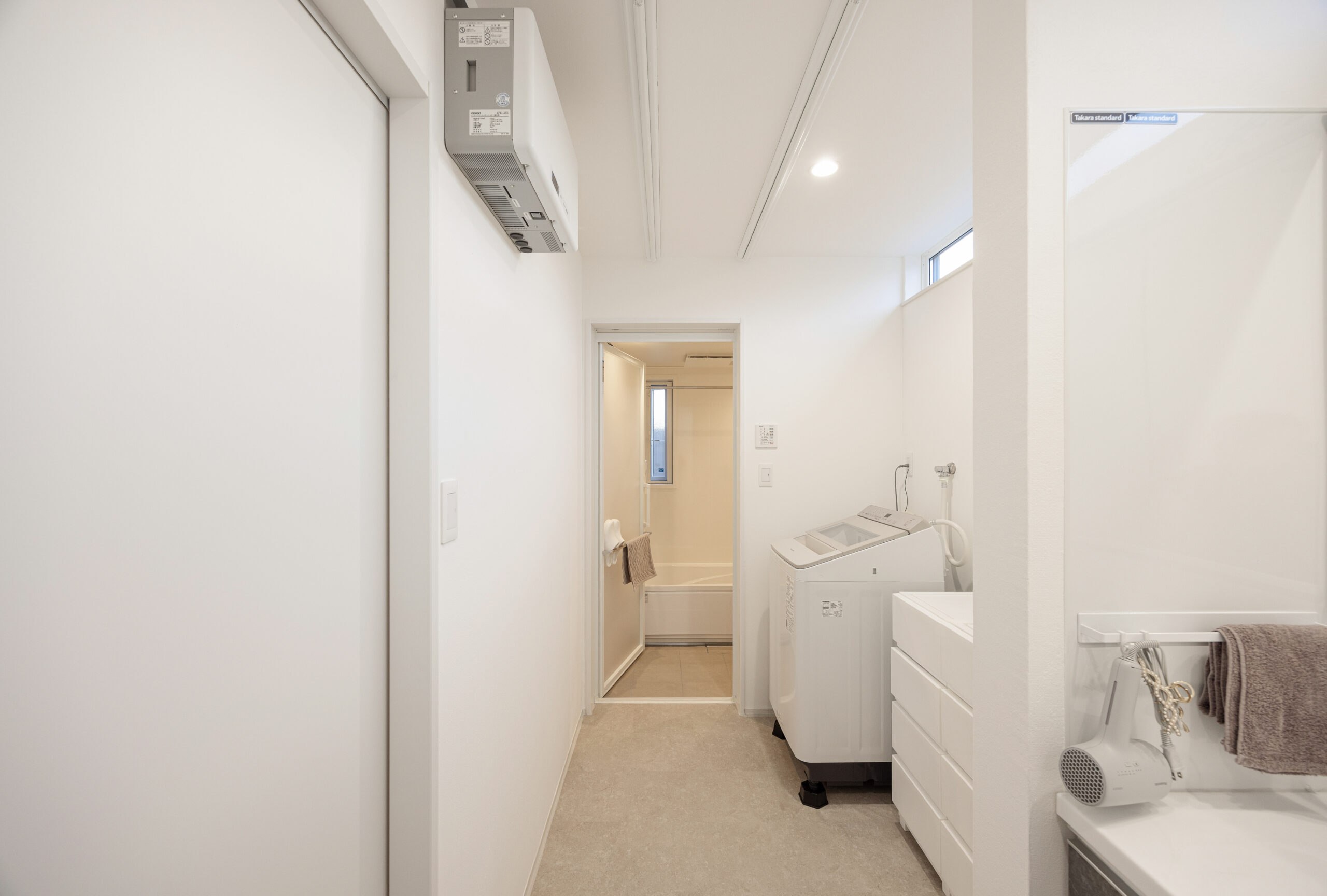 洗面台・脱衣所・浴室を一直線に配置したことで、家事の移動がスムーズになり、毎日の暮らしにゆとりを与えます。細窓から差し込む自然光で日中は明るく快適に。天井にはホスクリーンを備え、天気に左右されず室内干しが可能です。浴室は温かみのあるカラーでコーディネートし、落ち着いた雰囲気に。さらにタカラスタンダードのホーロー壁を採用し、浮かせる収納で床やカウンターを清潔に保てる工夫も。掃除の手間が減り、快適さと美しさを長く維持できます。