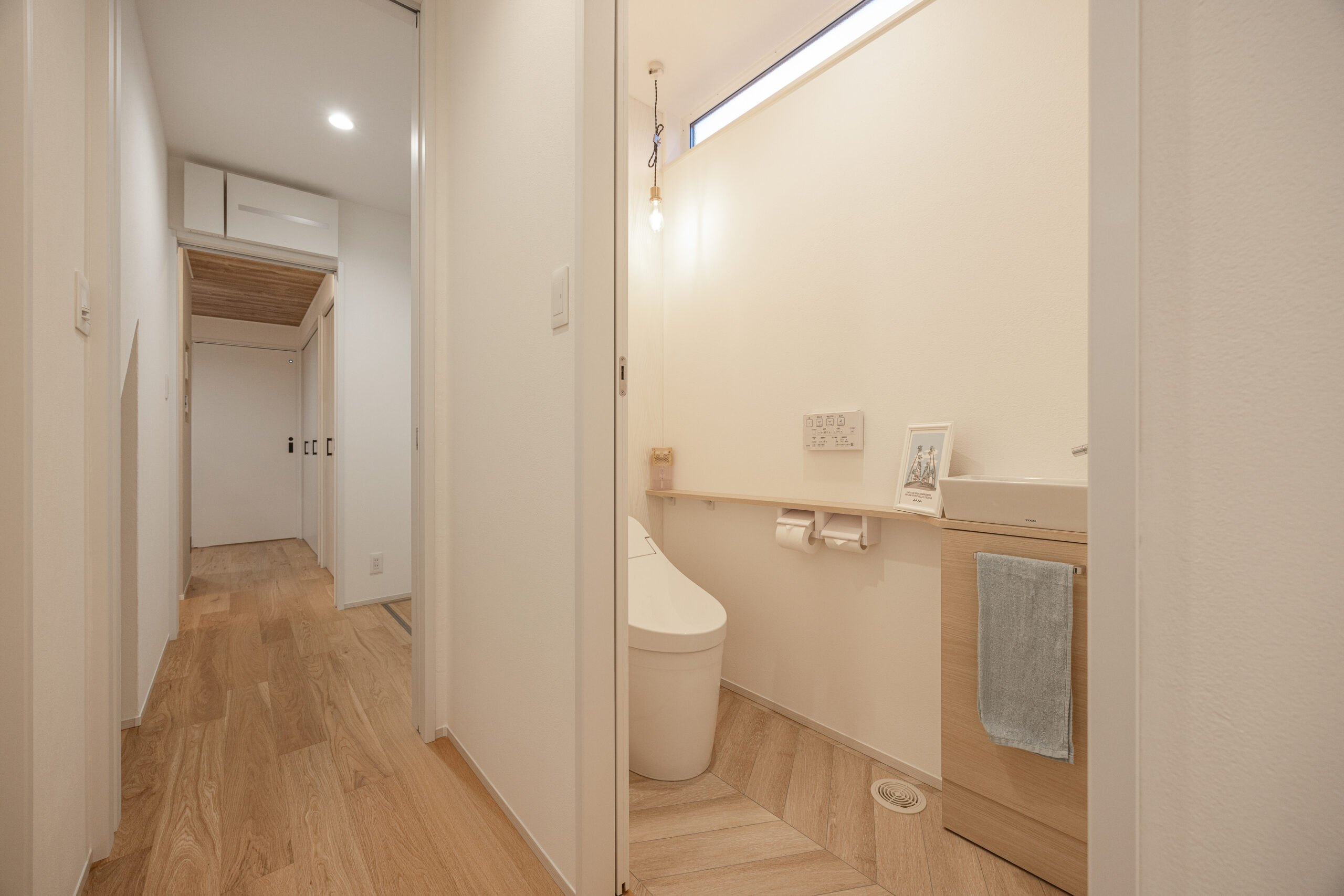 廊下には扉のないオープン収納を設け、よく使う日用品をさっと片付けられる便利さを実現。階段下のスペースも無駄なく活かし、暮らしやすさにつなげました。1階のトイレは清潔感のある落ち着いた雰囲気にまとめつつ、吊り下げライトや壁柄で遊び心をプラス。見切り材には木目を採用し、分け目が目立ちすぎず一体感のある空間に仕上げています。