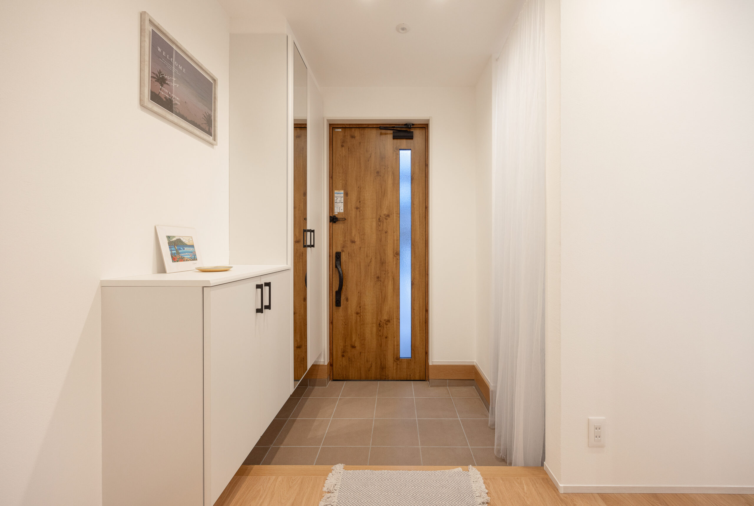 玄関はウッドトーンでまとめ、やわらかな印象を演出。正方形タイルが可愛らしさを添え、来客を明るく迎え入れます。靴箱を置かず大容量の収納スペースを確保したことで、いつでもすっきりとした状態を保てるのもポイント。全身鏡を設置しているので外出前の身だしなみチェックも快適です。正面にはニッチを設け、家族のお気に入りの小物を飾れるように。実用性だけでなく、暮らしを楽しむ工夫が散りばめられています。