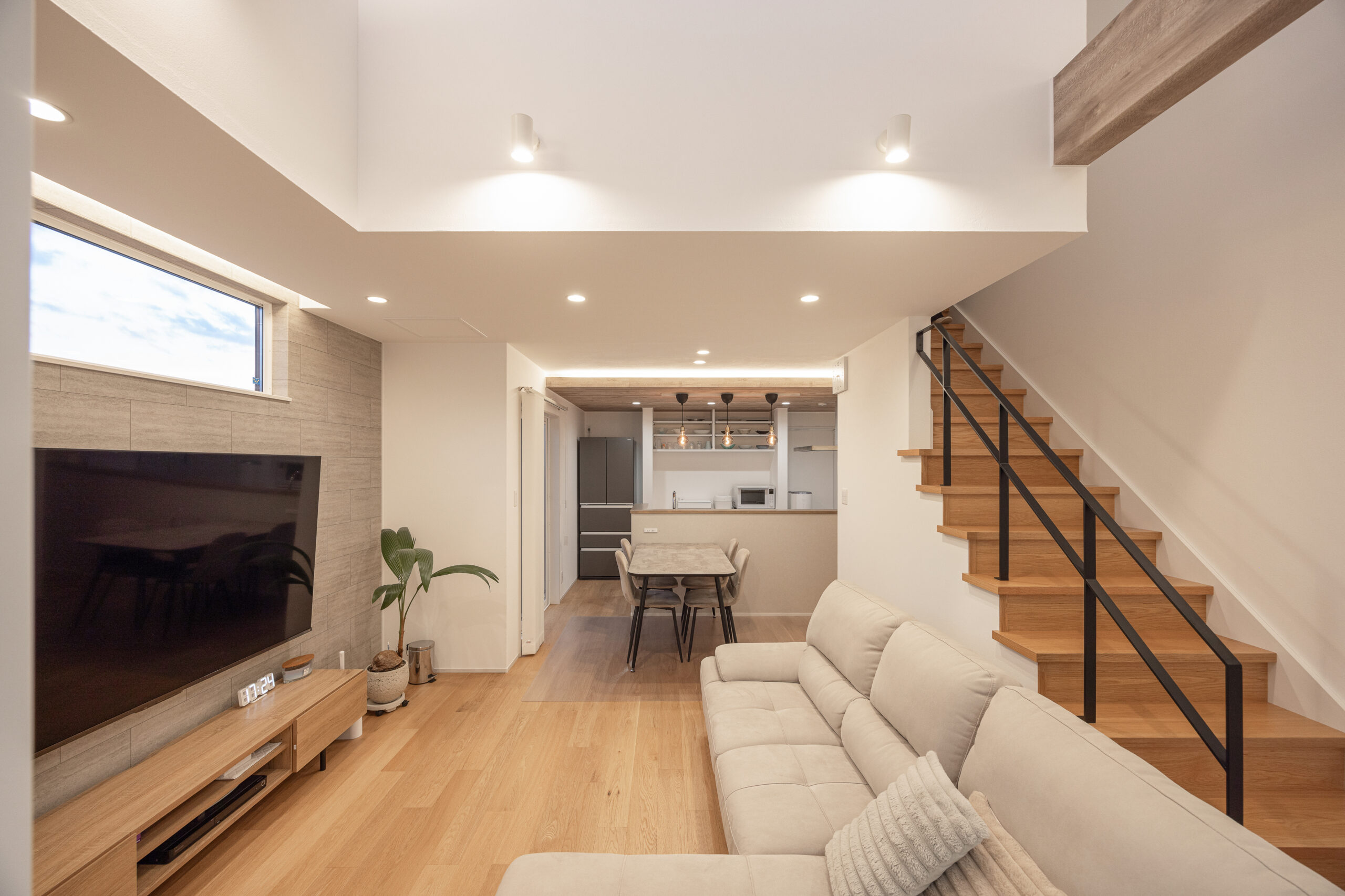リビングは高い天井と大きな吹き抜けによって、圧倒的な開放感を実現しました。アイアンの手すりがスタイリッシュなアクセントとなり、空間全体を引き締めています。昼間は明るい日差しが差し込み、自然光で心地よく過ごせる空間に。夜になると天井の間接照明が優しく灯り、落ち着いた雰囲気を演出します。壁掛けテレビや照明計画にもこだわり、家族が自然と集まりたくなる居心地の良いリビングとなりました。