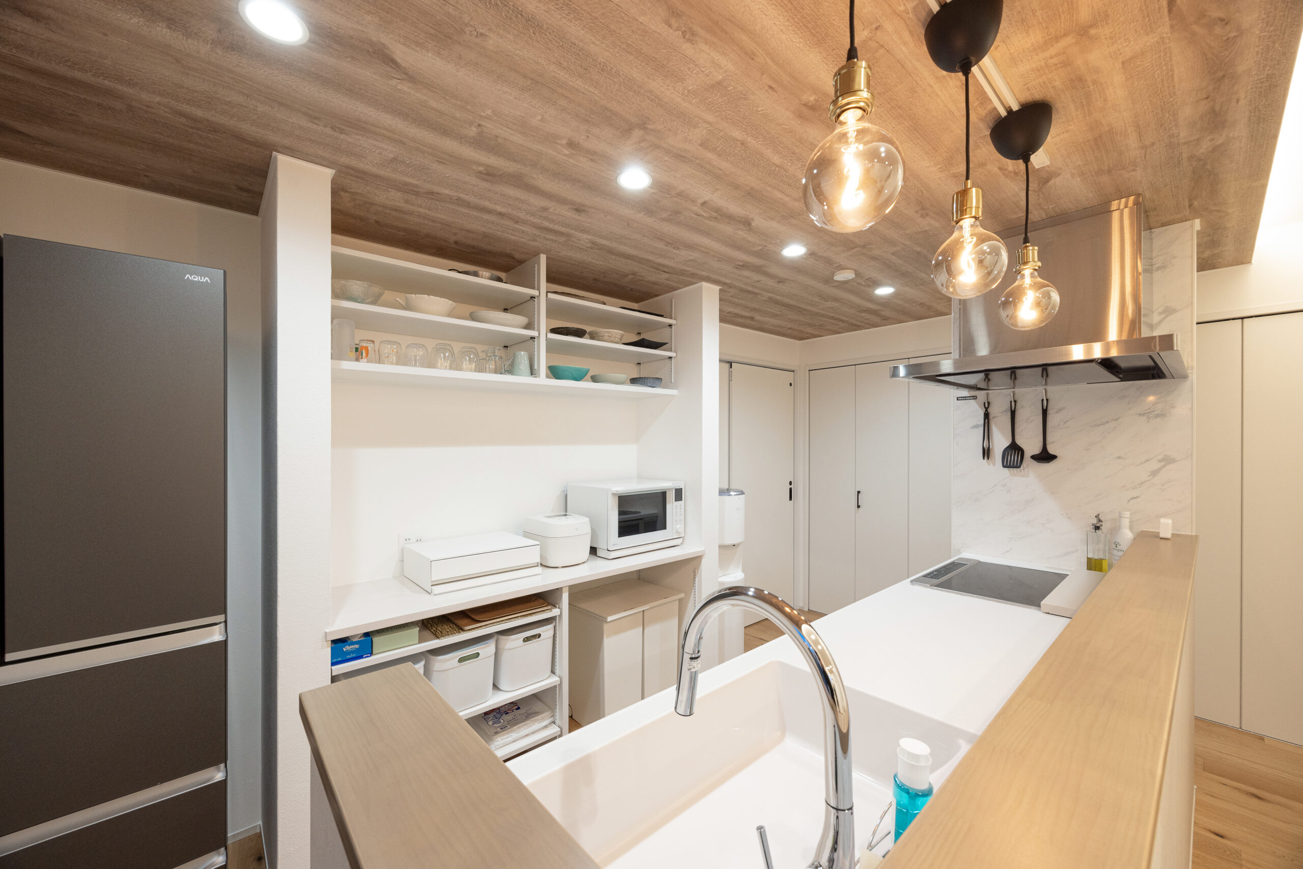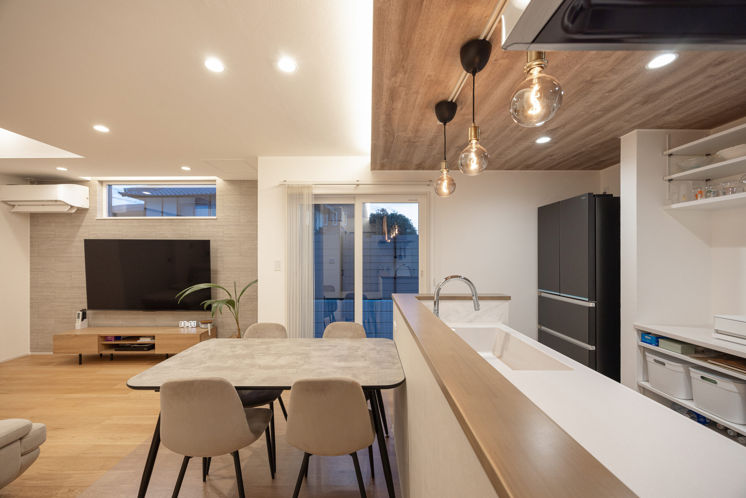 キッチンは下がり天井と間接照明を組み合わせ、空間にメリハリとお洒落な雰囲気をプラスしました。造作の収納棚は見た目にもすっきりとしていて、必要なものをすぐに取り出せる便利さが魅力です。リビングとつながる対面式なので、調理をしながら家族と会話を楽しむことができ、家事をしながらもコミュニケーションが生まれる空間に。壁の一部にはニッチを設け、スイッチ類をまとめることで、機能性とデザイン性を両立させています。